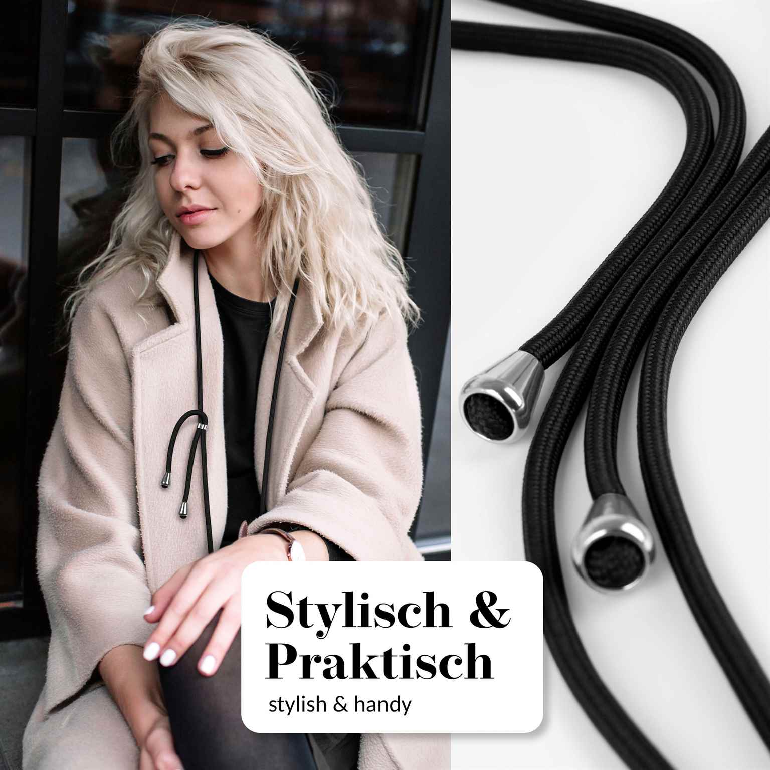 Trage dein Handy bequem wie eine Handtasche, Crossbody oder als Halskette – der Einleger wird einfach in die Hülle unter das Handy gelegt oder geklebt und durch die Ladeöffnung nach außen geführt.