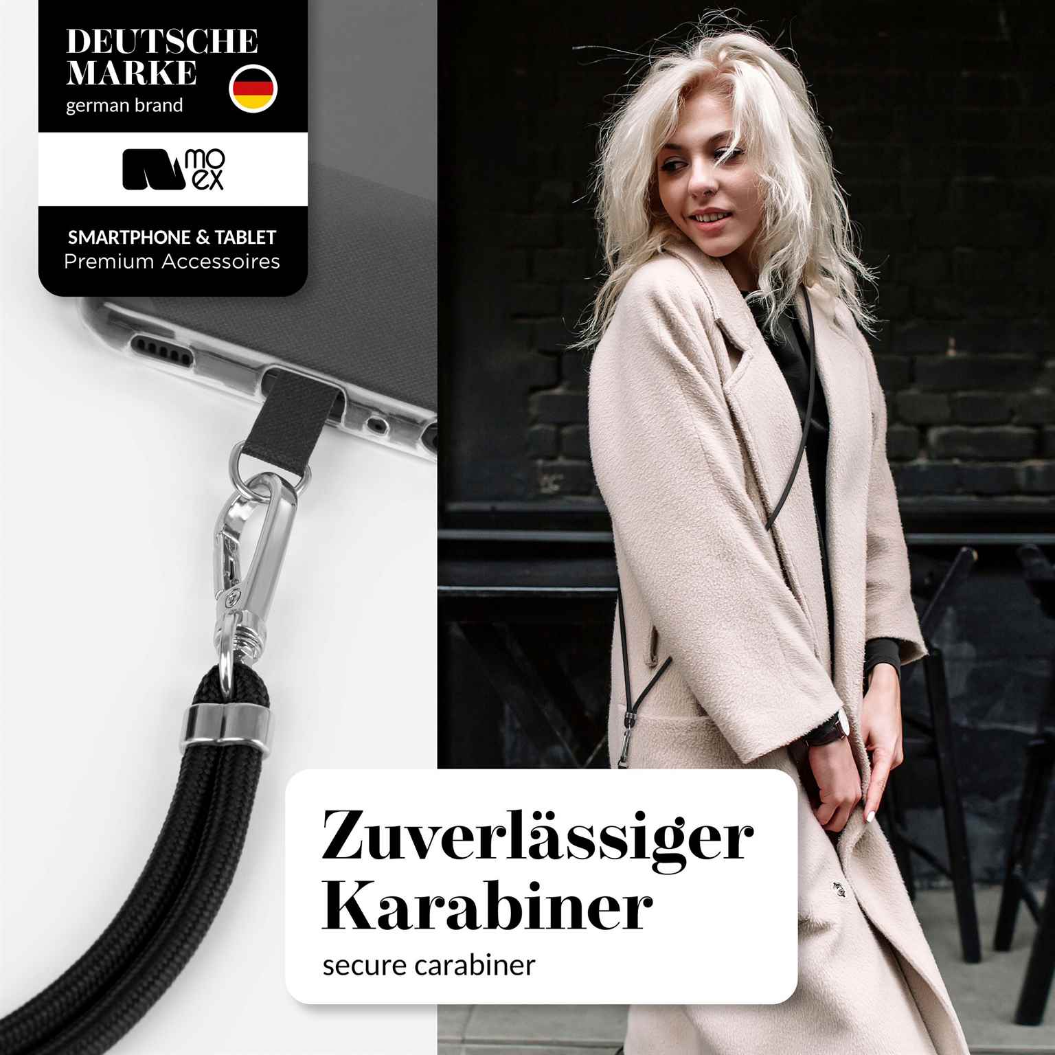 Das moex Unleash bietet dir maximale Freiheit: Die Handykette ohne Hülle lässt sich mit fast jeder Handyhülle nutzen – ganz einfach dank Case Einleger, der zwischen Smartphone und Case geschoben wird. Mit dem stabilen Karabiner kannst du das Handyband jederzeit abnehmen oder wechseln – perfekt, wenn du dein Smartphone mal ohne Umhängeband tragen möchtest. Egal ob elegant, sportlich oder casual – die Kette passt zu jedem Look und sorgt dafür, dass dein Handy immer griffbereit bleibt. Durch die universelle Befestigung eignet sich das Band für viele Modelle und ist der perfekte Begleiter für Alltag, Events oder Reisen.