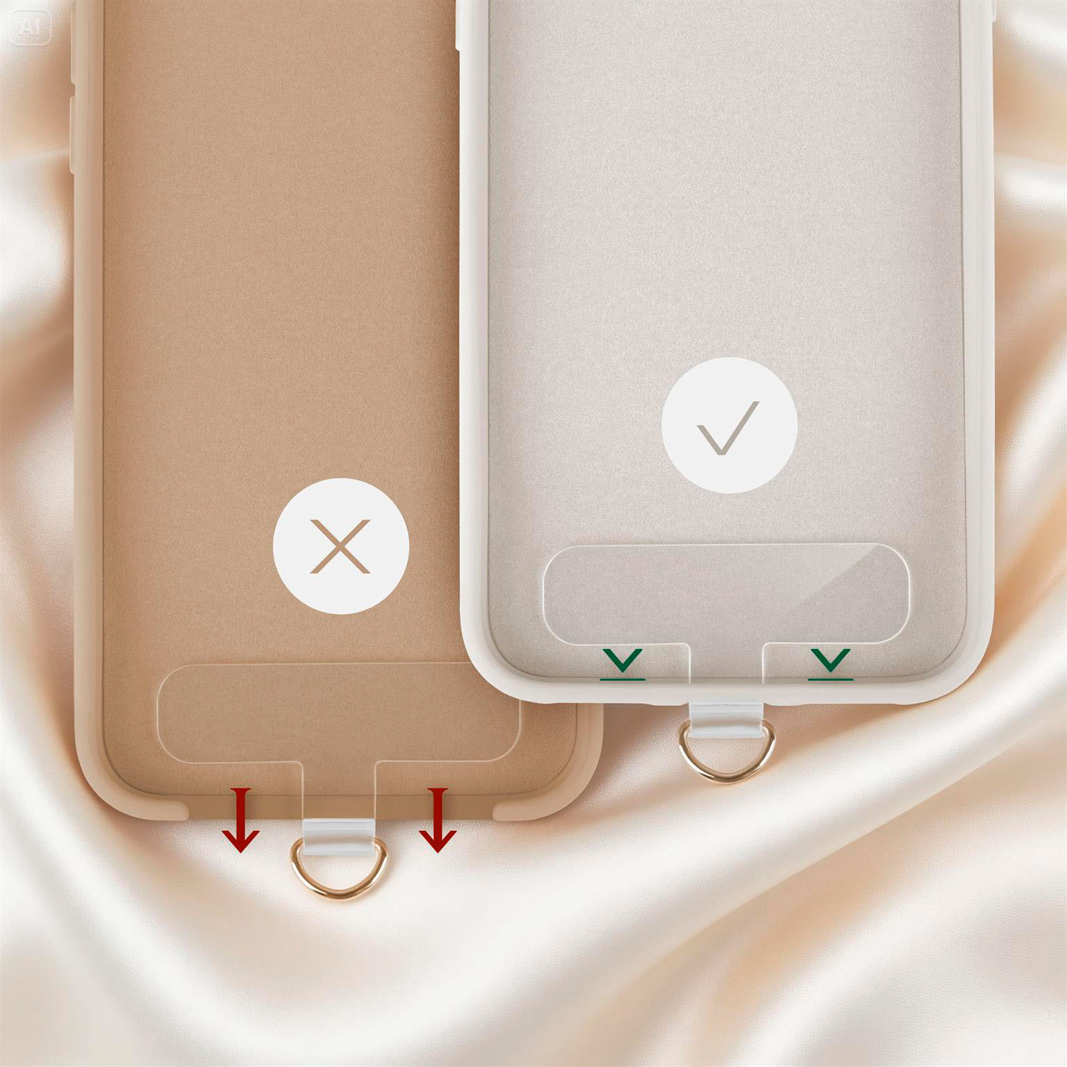 Das Prinzip ist genial einfach: Du legst den mitgelieferten, ultra-dünnen Einleger (Patch) in deine vorhandene Handyhülle. Die kleine Öse führst du durch die Ladeöffnung nach außen. Dann setzt du dein Handy ein und klickst die Karabiner der Kette an die Öse. Fertig!